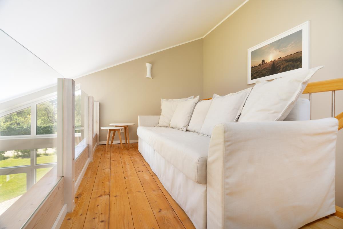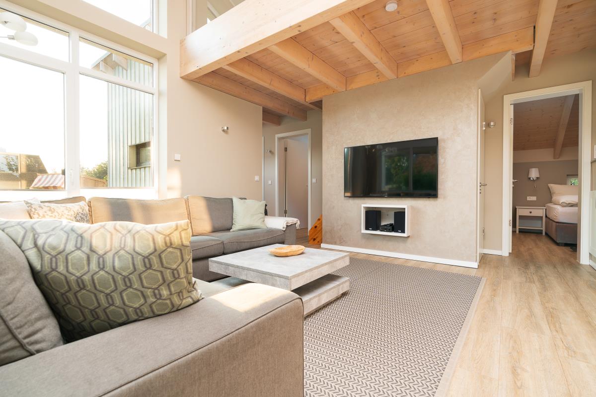 Haus Linde bietet Platz für 6-8 Personen, ist ideal für größere Familien, Familien mit Großeltern, oder zwei kleine Familien und Freunde. Offen gestalteter Wohnraum mit Ofen und bodentiefen Fenstern, drei Schlafzimmern mit Boxspringbetten, einer offenen Galerie mit Sofa, das zu einem Bett 140×90 umfunktioniert werden kann, ein großes Badezimmer mit Sauna und ein Gästebad. Haus Linde ist sehr gut ausgestattet und bietet den Komfort für einen erholsamen Urlaub. Um das Haus herum ist eine gepflegte Grünfläche eingesäumt von Sträuchern. Eine große Sonnenterrasse mit Sitzgruppe und Strandkorb, und eine teilüberdachte Terrasse, bieten Möglichkeiten um es sich draußen schön zu machen, zum Sonnen, zum Grillen oder zum Toben. Parkplatz ist am Haus.