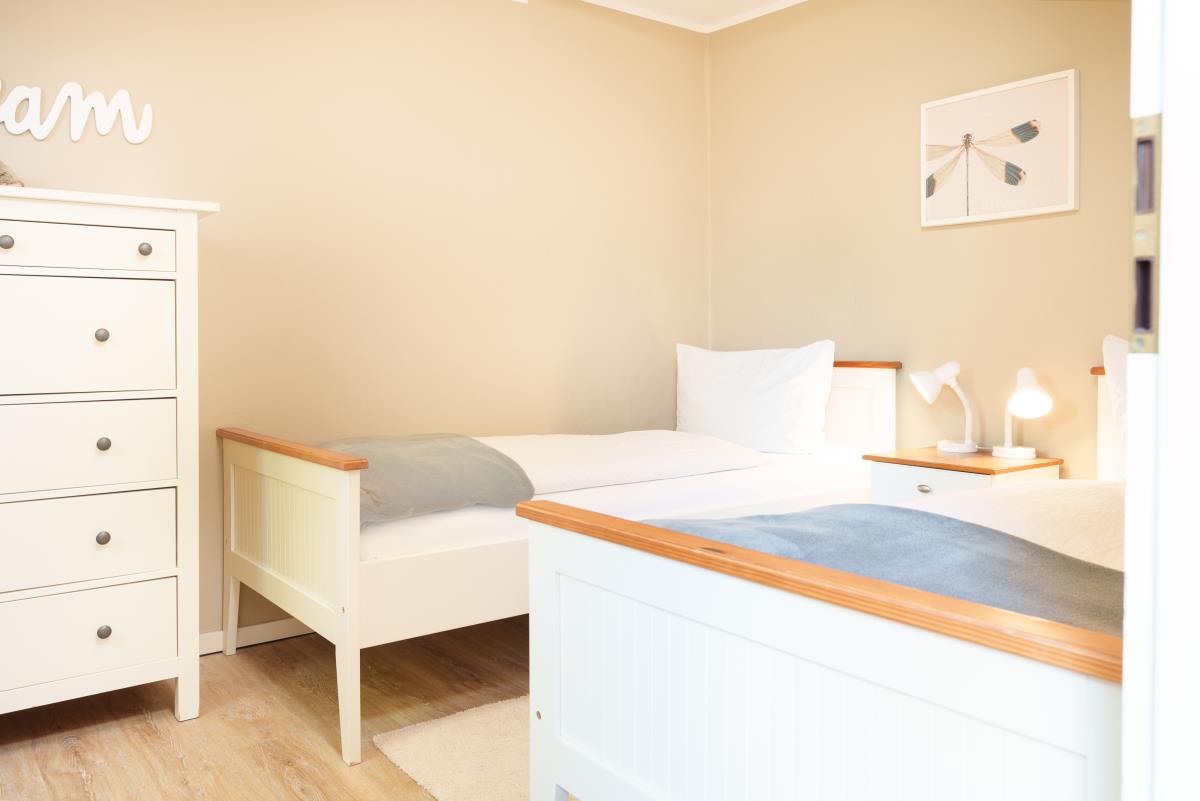 Ein Wohn-Essbereich mit Durchgang zur Küche, ein Schlafraum mit einem Doppelbett, ein Schlafraum mit zwei Einzelbetten und ein Badezimmer.