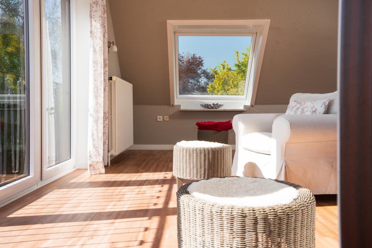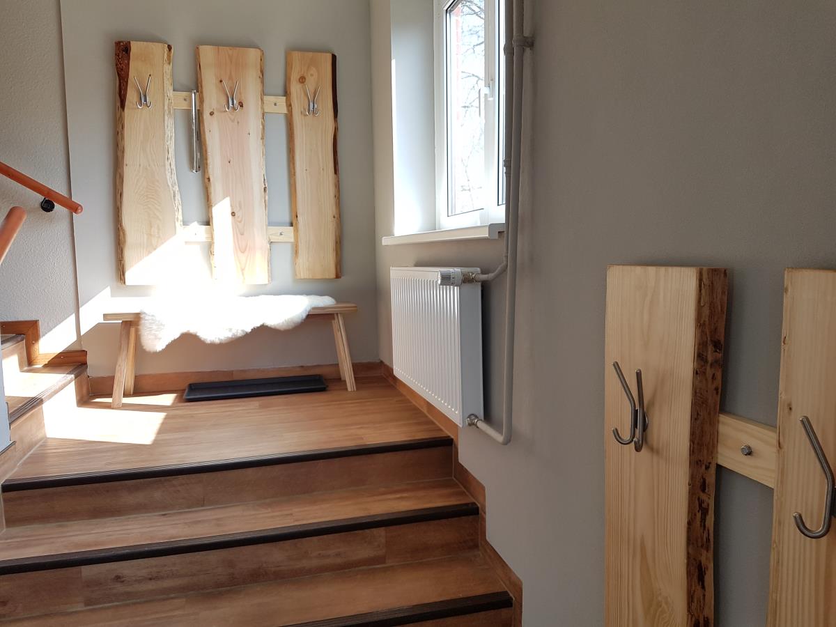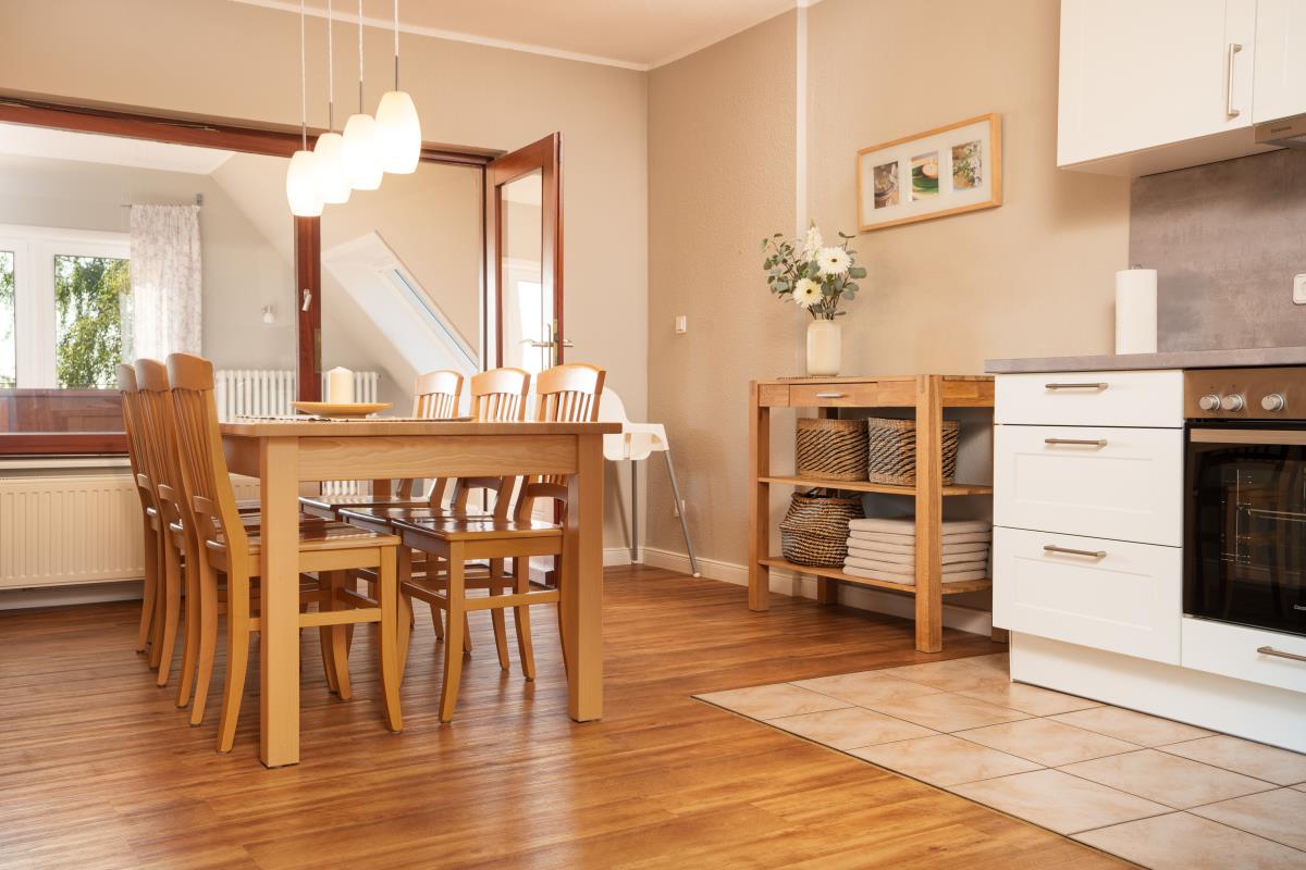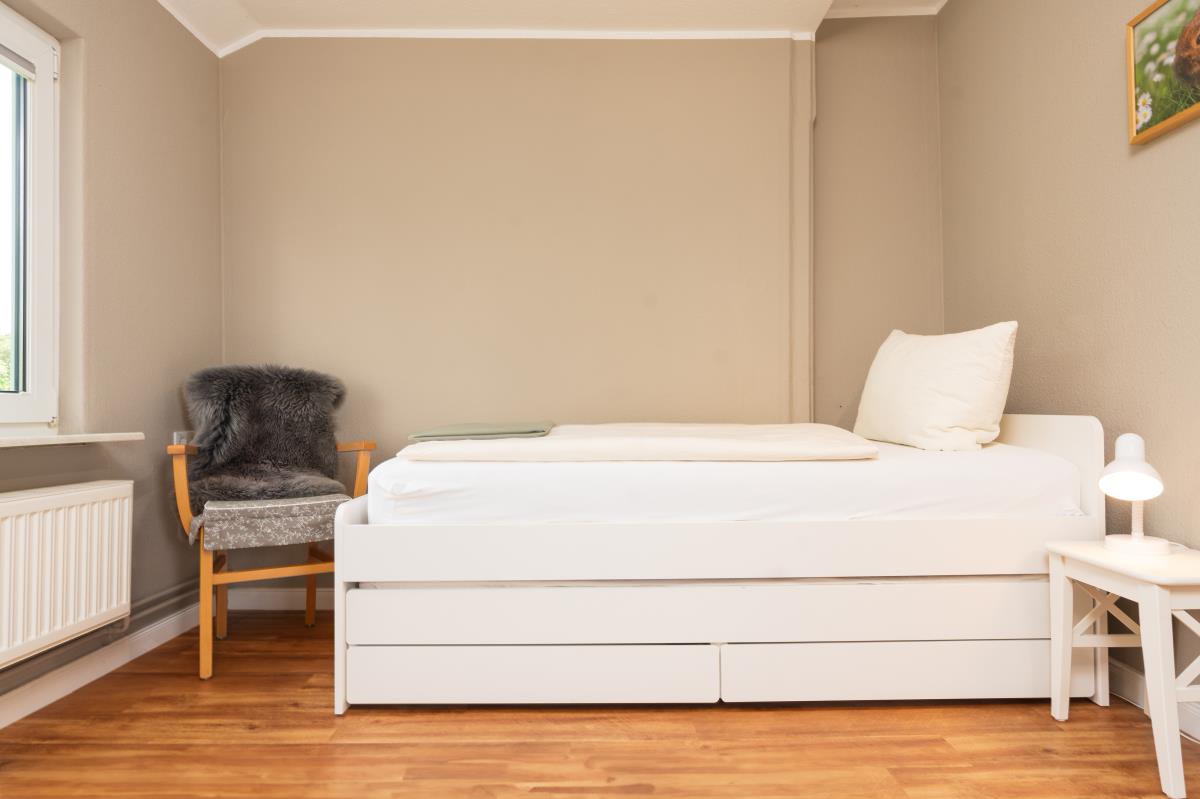 Wohnung Sonnenblume ist genau das Richtige für Platzbenötiger. Auf über 100qm befinden sich zwei große Schlafräume mit einmal einem Doppelbett mit extra hohen Matratzen, im anderen zwei Einzelbetten und auf Wunsch ein Zustellbett, eine Fernsehstube und eine große Sonnenstube mit Panoramablick, eine Küche mit Essplatz für 6 Personen und ein Badezimmer. Die Wohnung liegt auf der Südseite unseres Bauernhauses, so wie der Balkon. Auf dem überdachten und windgeschützen Balkon lässt es sich schon im Frühjahr und auch noch im Herbst gemütlich draußen sitzen. Das Highlight ist die Sonnenstube mit dem Panoramablick. Die Flügeltüren zur Westseite ausgerichtet lassen sich weit öffnen und man bekommt ein Drinn-Draußengefühl. Der einmalige Blick über die Felder ins Autal und weiter bis zur Ostsee mit wunderschönen Sonnenuntergängen ist oft Atemberaubend.
